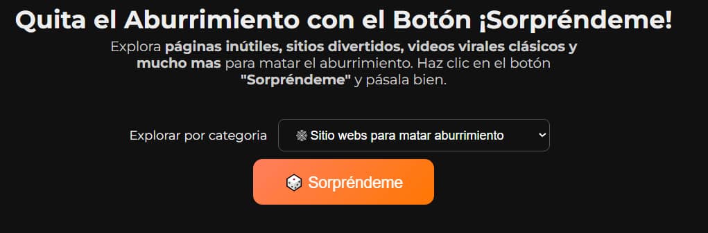 Con solo un clic, un botón te lleva a un universo de diversión sin fin. Este sitio es tu cura para el aburrimiento, ofreciendo una variedad de funciones según la categoría que selecciones: