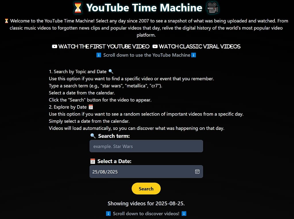 ¿Te gustaría saber qué videos estaban cargándose en YouTube el día de tu cumpleaños, o en cualquier otra fecha importante? este sitio simula a una Máquina del Tiempo de YouTube te permite viajar al pasado digital. Simplemente elige una fecha y la herramienta te mostrará videos musicales, noticias, trailers y videos al azar que se subieron ese día. ¡Redescubre la historia de la web y sorpréndete!